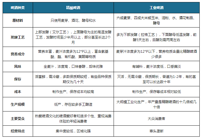 就精釀啤酒本身的特點來看,精釀的口感超越普通啤酒的口感。與工業(yè)啤酒相比,精釀啤酒在原材料、發(fā)酵工業(yè)、營養(yǎng)成分、風(fēng)味、保存、成本、生產(chǎn)規(guī)模、受眾人群及經(jīng)營特點均有所不同,其成本更高、營養(yǎng)成分更加豐富、口味香醇、后味優(yōu)雅。