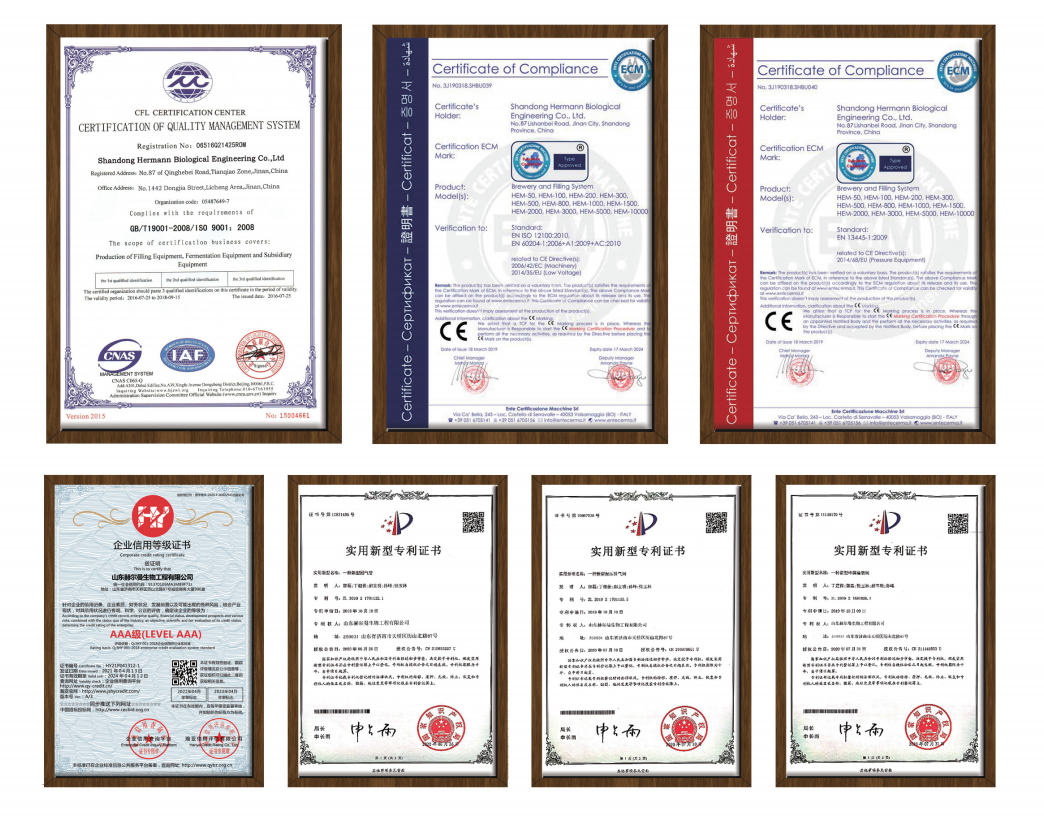 創新是一個企業發展的靈魂!匯冠公司非常注重技術研發,已通過高新技術企業認定,擁有ISO 9001:2008質量體系國際認證、CE認證、UL認證、SGS認證。依靠自主創新,填補多項國內空白其發明專利40余項,國際認證專利19余項,不僅是中國輕工機械協會理事單位,還是中國輕工機械行業精釀啤酒釀造裝備十強企業。