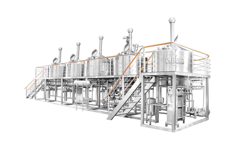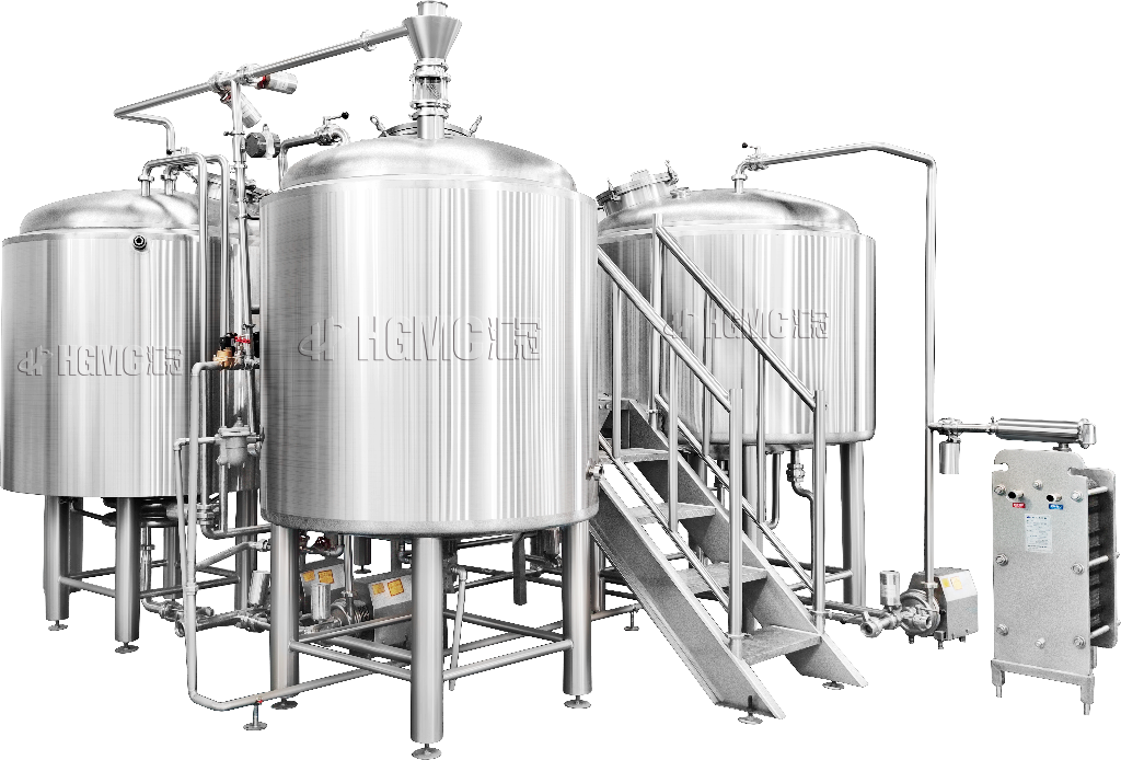 四器則是糖化在糖化罐、過濾在過濾槽、煮沸有煮沸鍋、漩沉在漩沉罐中分步進行,額外配備了板式換熱器和冷熱水罐,增加了工作效率。可以進行連續多批次生產,一天可以生產2-6個批次的啤酒。