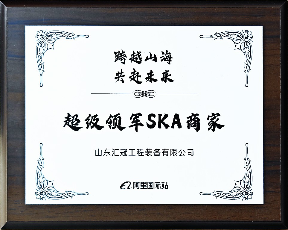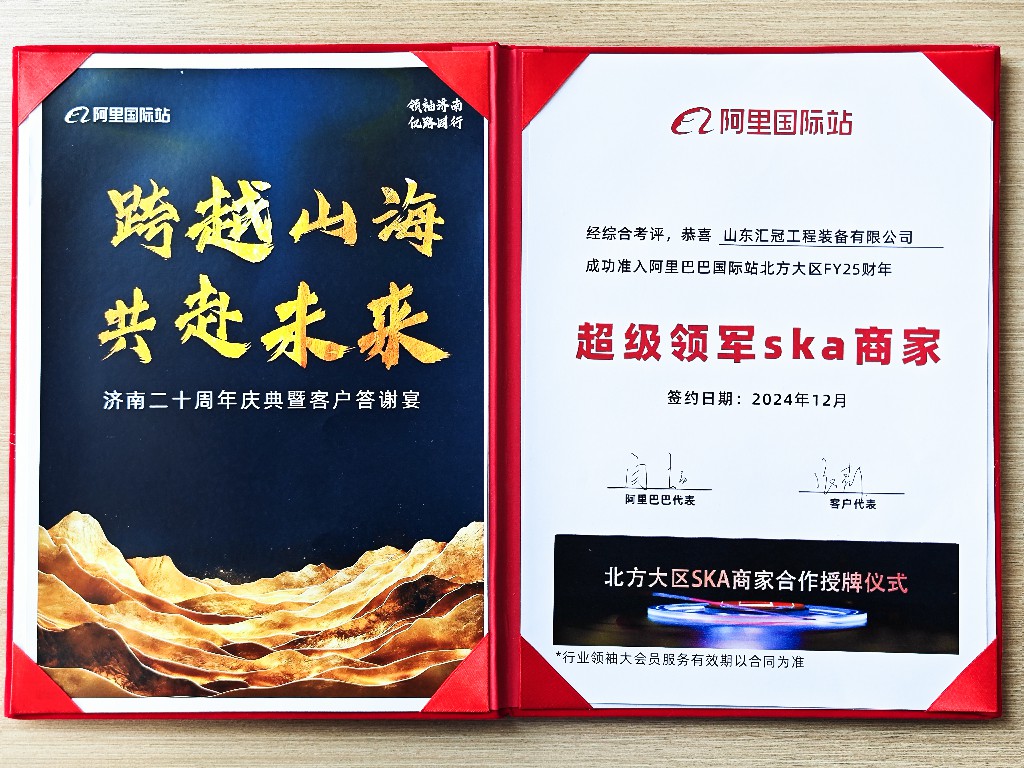 在 2024 年 12 月 ,山東匯冠工程裝備有限公司成功準入阿里巴巴國際站北方大區 FY25 財年,繼續保持超級領軍 SKA 商家,這也標志著匯冠在國際貿易領域將繼續新的征程,進一步拓展海外市場,提升企業在國際影響力與競爭力,將在全球商業舞臺上迎來更多發展機遇。
